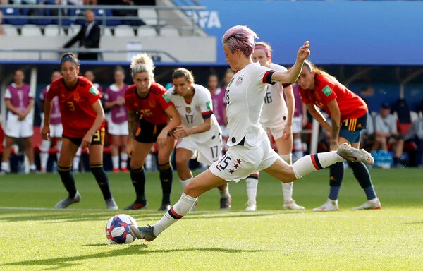 Soccer Football – Women’s World Cup – Round of 16 – Spain v United States – Stade Auguste-Delaune, Reims, France – June 24, 2019 Megan Rapinoe of the U.S. scores their second goal from the penalty spot REUTERS/Bernadett Szabo>Women’s World cup 2023