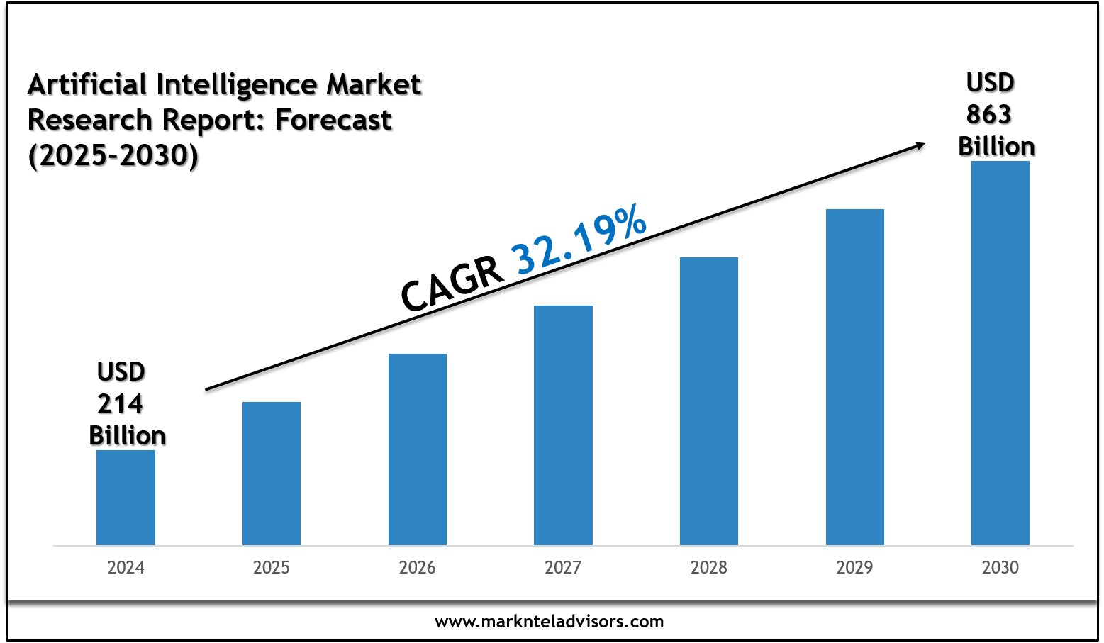 The Global Artificial Intelligence Market size was valued at USD 214 Billion in 2024 and is projected to reach USD 863.79 Billion by 2030. Along with this, the market is estimated to grow at a CAGR of around 32.19% during the forecast period, i.e., 2025-30. Most of the market growth would be propelled by the growing awareness across different industries about the advent of new technologies that can help them expedite research, development, production, & distribution processes, i.e., leading to increasing investments in Artificial Intelligence (AI)-based solutions to improve the functionality & performance of their operations at low costs.