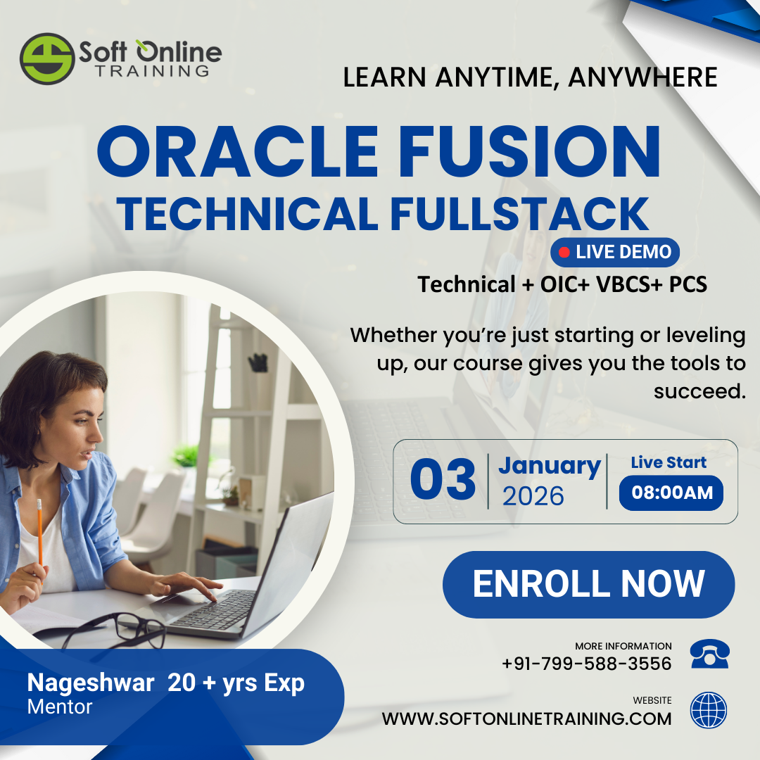Join our Oracle Fusion Technical Full Stack Online Training live demo on 03 January 2026 at 8:00 AM IST and get a simple, practical introduction to Oracle Fusion Cloud technical concepts used in real-world enterprise environments. This free online session is designed for learners who want to understand how Oracle Fusion Technical works without complexity.