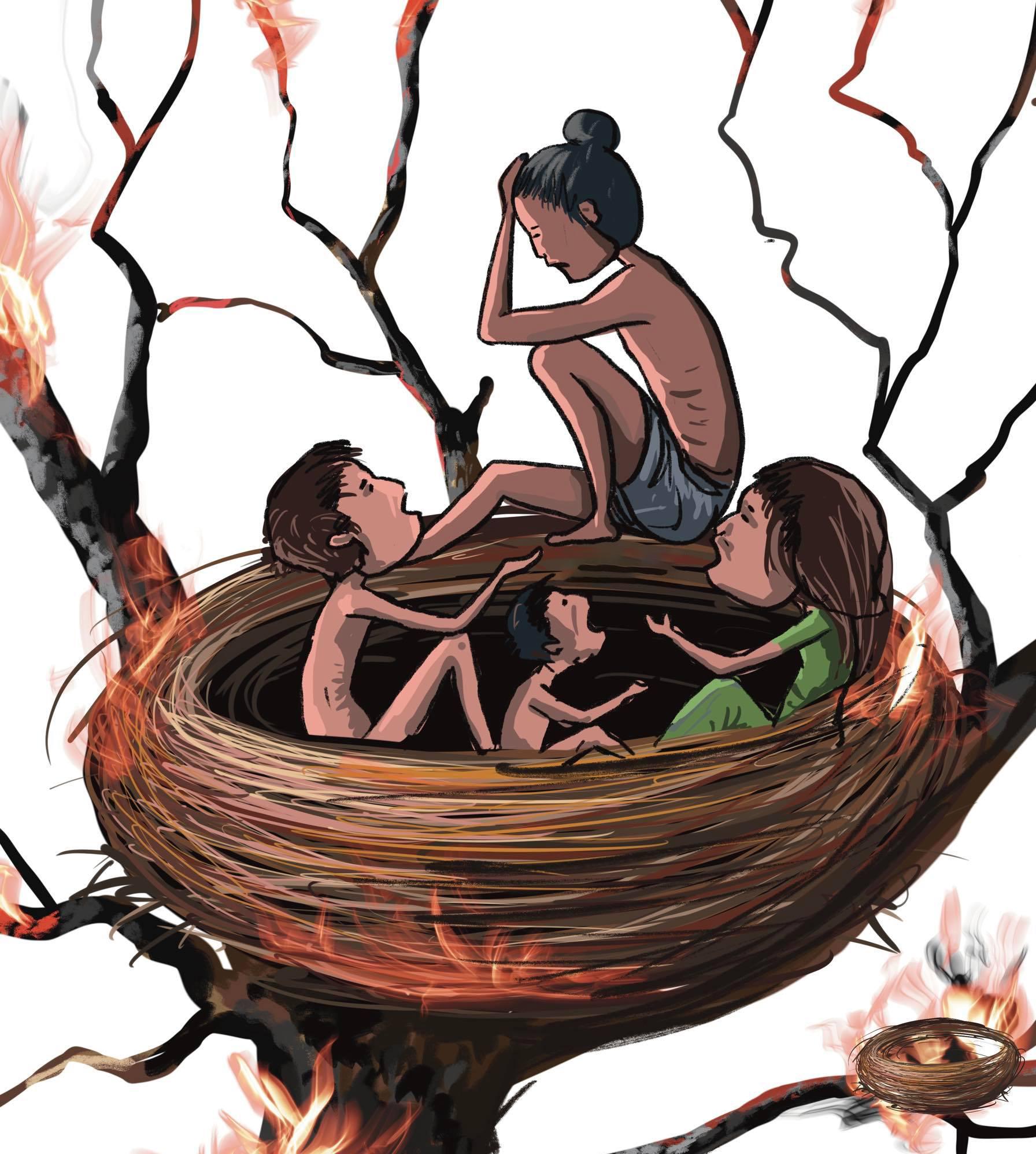 Most of the neighbors in the fire-affected areas have no food in their houses. They are living a dehumanized life boiling the forest herbs.