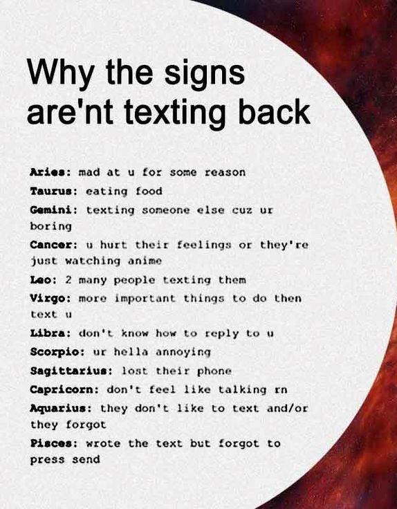 Hey Everyone!!! Are you tensed that why your Boyfriend or Girlfriend is not texting you back !! Well !! Check out the following pic!! If you know his/her zodiac sign, just take a look at this photo!! And solve your tension in a blink !! Chilling in a relationship is very important!! If someone is not texting you back!! I say better stop texting him/her !! And text someone else like your best friend or someone more important in your life !!