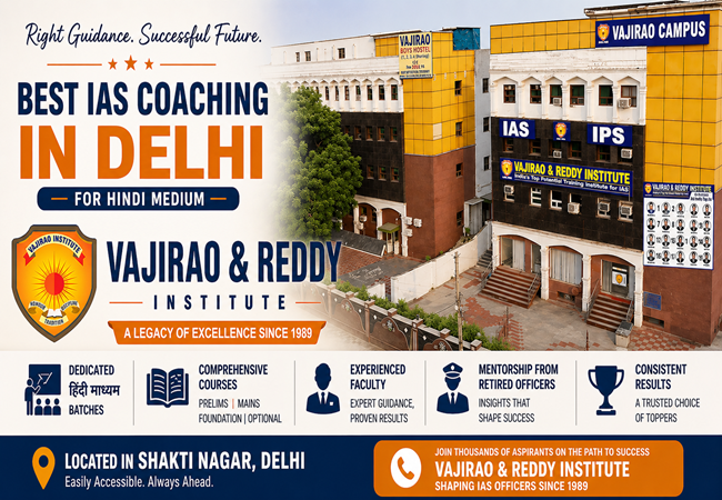 Vajirao and Reddy Institute, established in 1989, is a prominent and long-standing best IAS coaching in Delhi, offering dedicated Hindi medium batches for UPSC preparation. Located in Shakti Nagar, the institute provides comprehensive courses for Prelims, Mains, Foundation, and Optional subjects. Vajirao and Reddy is Known for experienced faculty, mentorship from retired officers, and consistent results, Vajirao and Reddy have earned a strong reputation among UPSC aspirants.