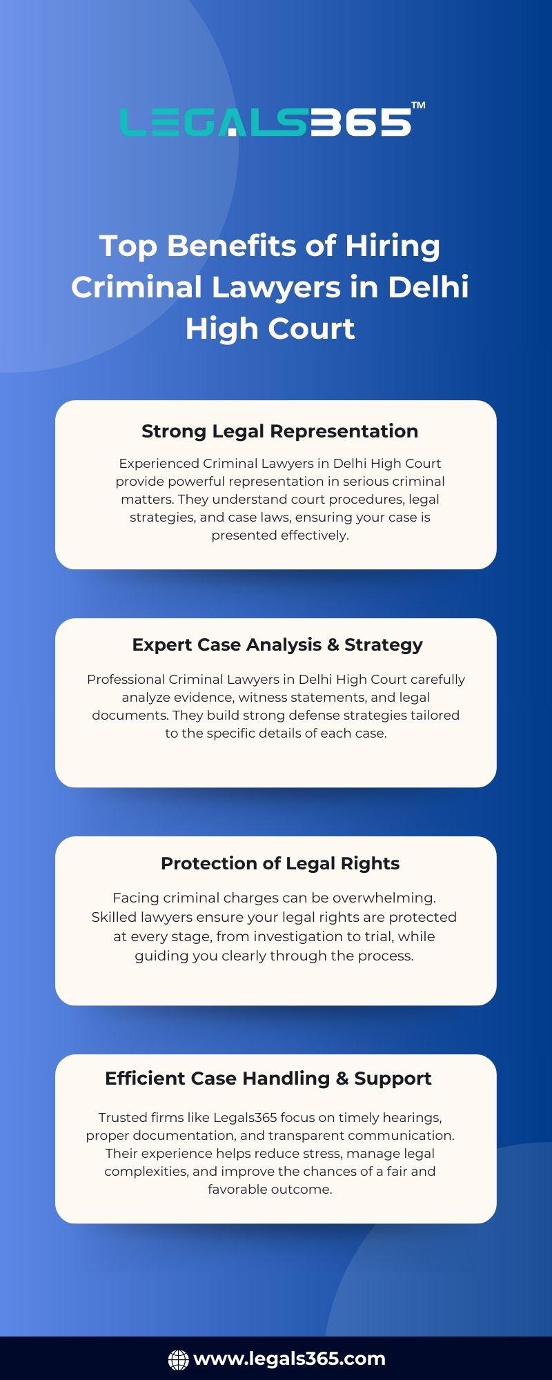 Top Benefits of Hiring Criminal Lawyers in Delhi High Court 1. Strong Legal Representation Experienced Criminal Lawyers in Delhi High Court provide powerful representation in serious criminal matters. They understand court procedures, legal strategies, and case laws, ensuring your case is presented effectively. 2. Expert Case Analysis & Strategy Professional Criminal Lawyers in Delhi High Court carefully analyze evidence, witness statements, and legal documents. They build strong defense strategies tailored to the specific details of each case. 3. Protection of Legal Rights Facing criminal charges can be overwhelming. Skilled lawyers ensure your legal rights are protected at every stage, from investigation to trial, while guiding you clearly through the process. 4. Efficient Case Handling & Support Trusted firms like Legals365 focus on timely hearings, proper documentation, and transparent communication. Their experience helps reduce stress, manage legal complexities, and improve the chances of a fair and favorable outcome. Visit Us - https://www.legals365.com/criminal-lawyers-in-delhi/